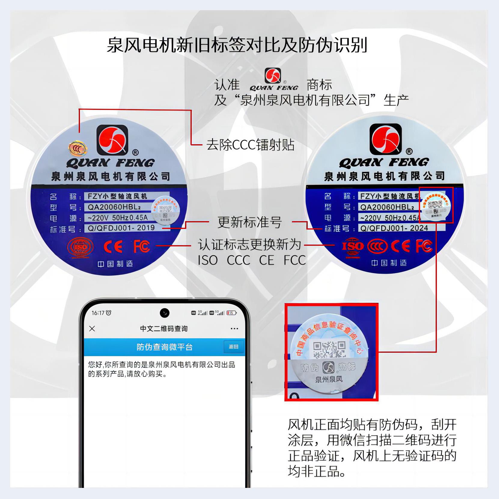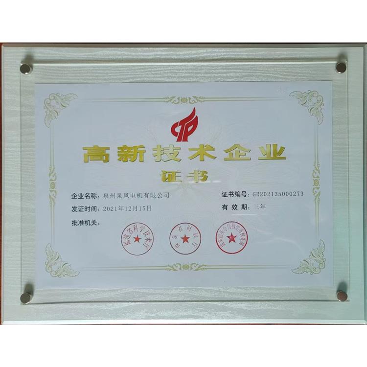 ??公司以建立現代化企業(yè)為目標,堅持“科技是首要生產力”,于2000年通過了ISO9001:2000國際質量體系認證、產品已獲得CCC強制性認證;美國UL、加拿大CUL、歐盟CE等安全認證。并獲得國家微電機產品檢測中心授予“行業(yè)監(jiān)督抽查合格單位”及“九五質量水平優(yōu)秀單位”,“泉風”牌風機被中國技術協會確定為 “風機行業(yè)質量十佳放心品牌”、“中國軸流風機十佳名優(yōu)品牌”。“泉風”牌產品已通過福建省新產品鑒定并獲得“福建省科技成果獎”、“省級優(yōu)秀新產品獎”、“省級科技進步獎”。 2006年度被福建省確認為“福建省高新技術企業(yè)”、“科技進步先進企業(yè)、“福建知名科技企業(yè)”。 “泉風”牌商標被評為“泉州市知名商標”。 2009年“泉風”牌商標被評為“福建省著名商標”。